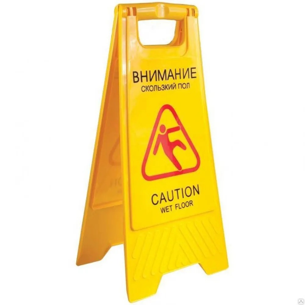 Предостерегает окружающих людей от падения на скользком полу. Необходим во время уборки помещений. Использование такого знака предупредит возможные травмы, обозначит границы убираемой площади и просто создаст положительный имидж о заботе об окружающих людей.