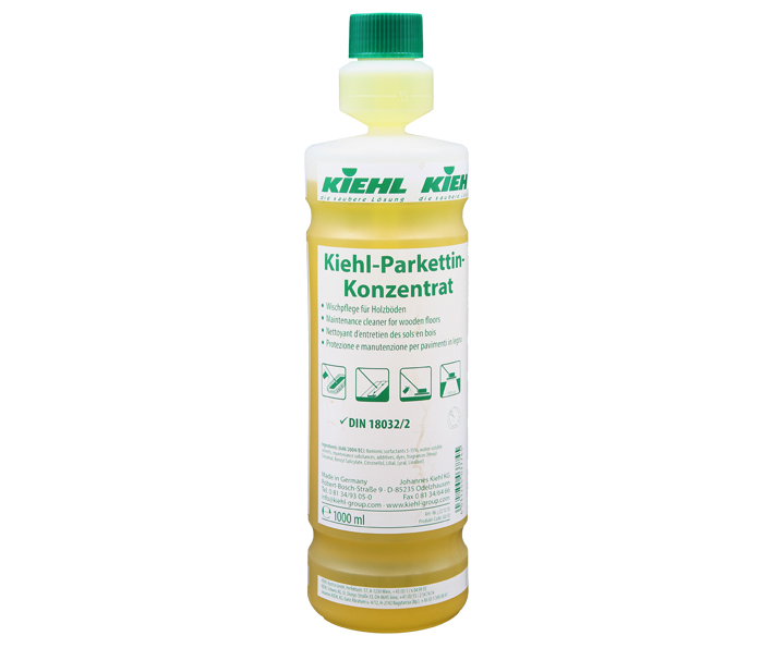 Эффективно очищает и распространяет приятный запах. Высыхает без разводов. Образует на поверхности пола износостойкую грязеотталкивающую и нескользкую защитную плёнку. После обработки пола с Kiehl-Parkettin-Konzentrat коэффициент трения скольжения лежит в пределах нормы DIN 18032. Снижает образование следов обуви. Паркетная доска и ламинат получают дополнительную защиту от проникновения влаги.