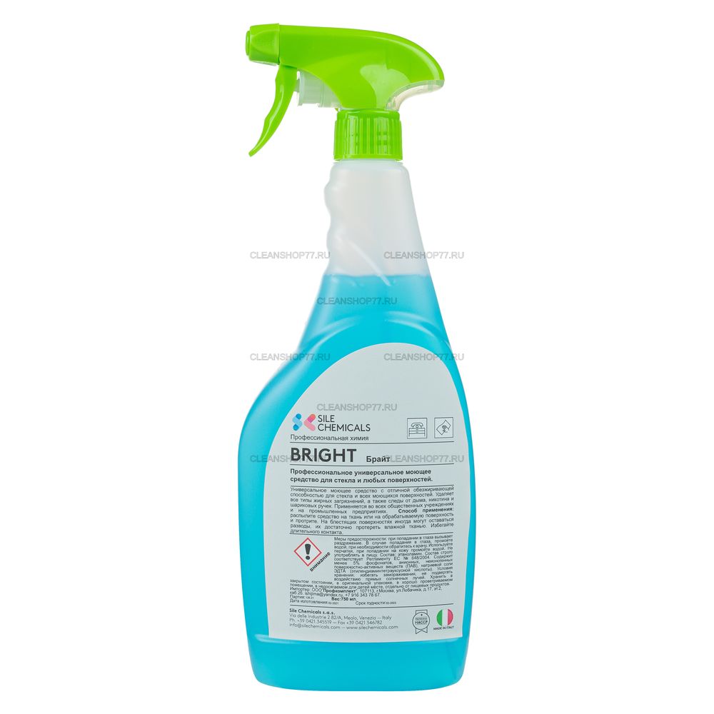 Sile Bright - профессиональное моющее средство с отличной обезжиривающей способностью для стекла и всех моющихся поверхностей. Удаляет все типы жирных загрязнений, а также следы от дыма, никотина и шариковых ручек.